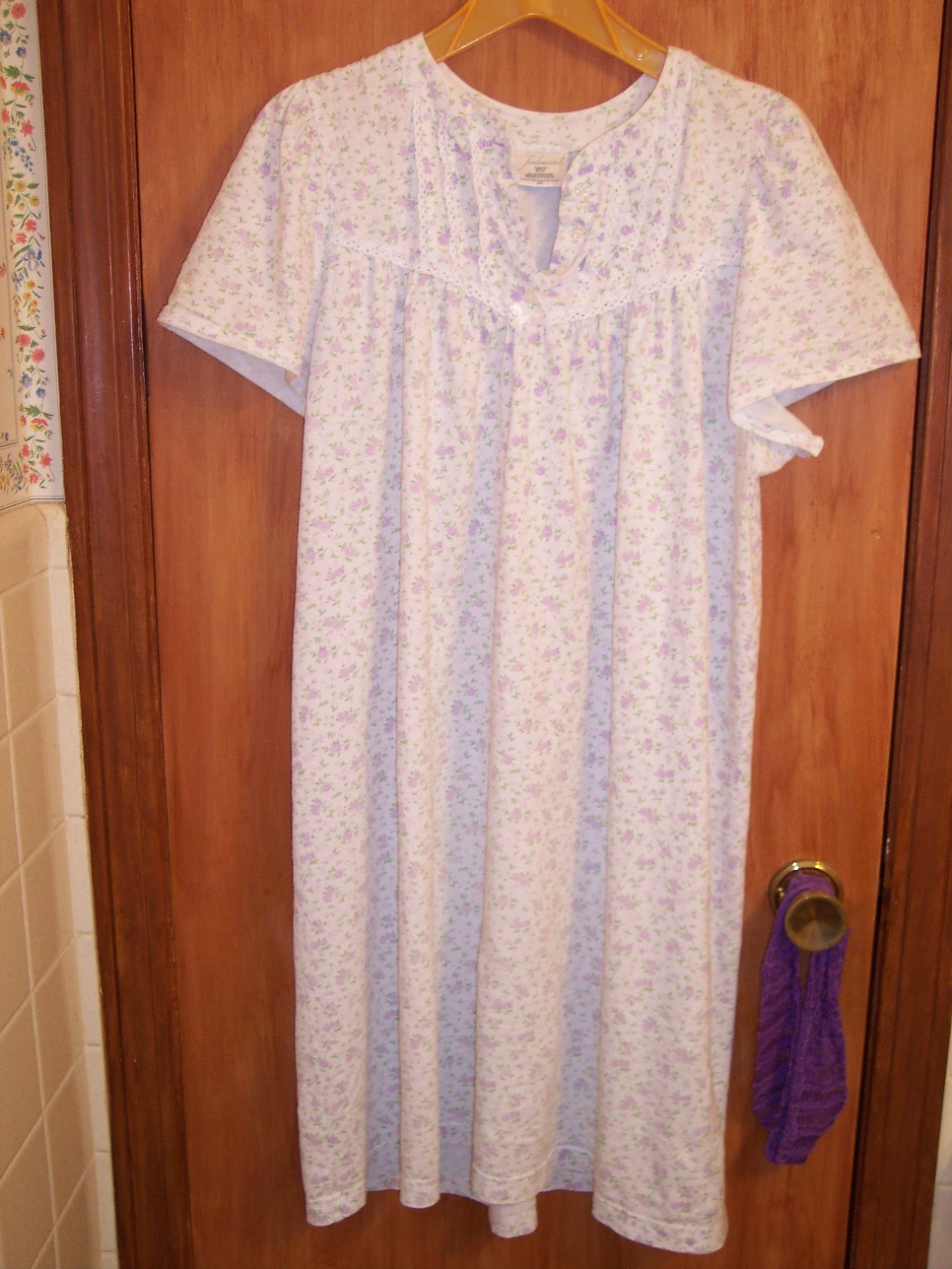 Years pass. One day the granddaughter, grown, is walking through a Sears on her way to somewhere else. She is not looking for clothes, but she is suddenly brought to a complete stop in the lingerie section. Now keep in mind that this is Sears. The "lingerie" is Playtex bras and packages of tube socks. But what has stopped the granddaughter cold is not a bra designed for women with breasts shaped like torpedoes. It is The Nightgown, a cotton summer nightgown almost identical in style to the one she disparaged so many years ago, complete with little purple flowers and lace detailing on the front.