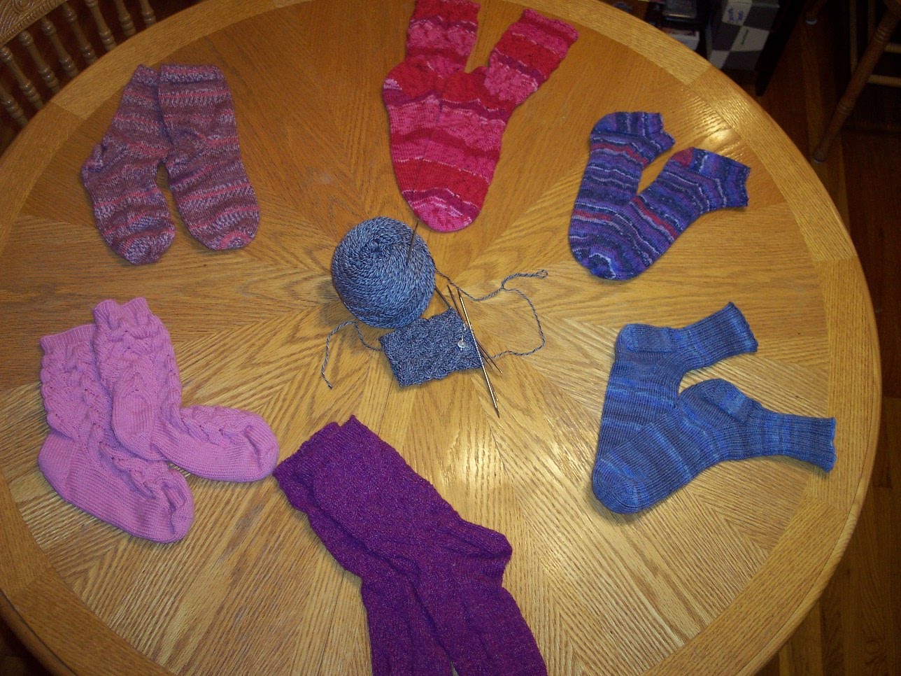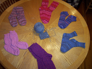 3. Mail me the yarn (remember, that's 800-900 total yards), your shoe size, and some general style preferences (e.g., lacy? ribbed? cabled?). I reserve the right to overrule your style preference if it doesn't match the yarn you sent (e.g., self-striping yarn is best in plain knit stitch, usually still pretty cool in ribbing, and looks downright dumb in fancy-pants lace and cables; ask me how I know).
