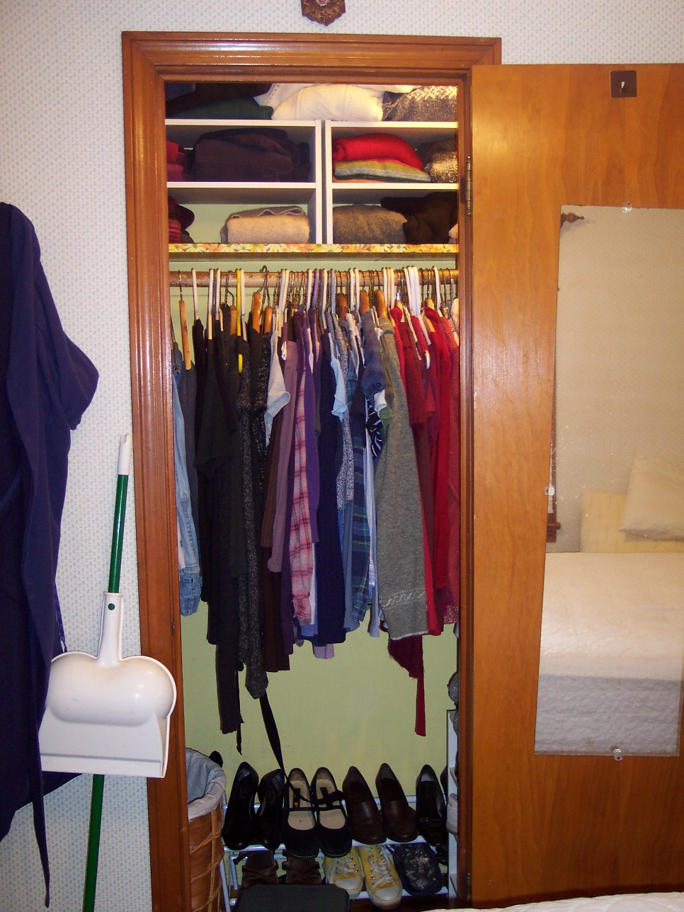 Today the state of my overflowing bedroom closet got the best of me and I started pulling things out to go to Goodwill. The master bedroom closet, the largest closet in the house, is 5 feet wide with a 2-foot door. It holds about two thirds of my clothes and has to be purged on a regular basis just to be able to see what's in there. But when this house was built it was intended to hold the complete wardrobes of two people.