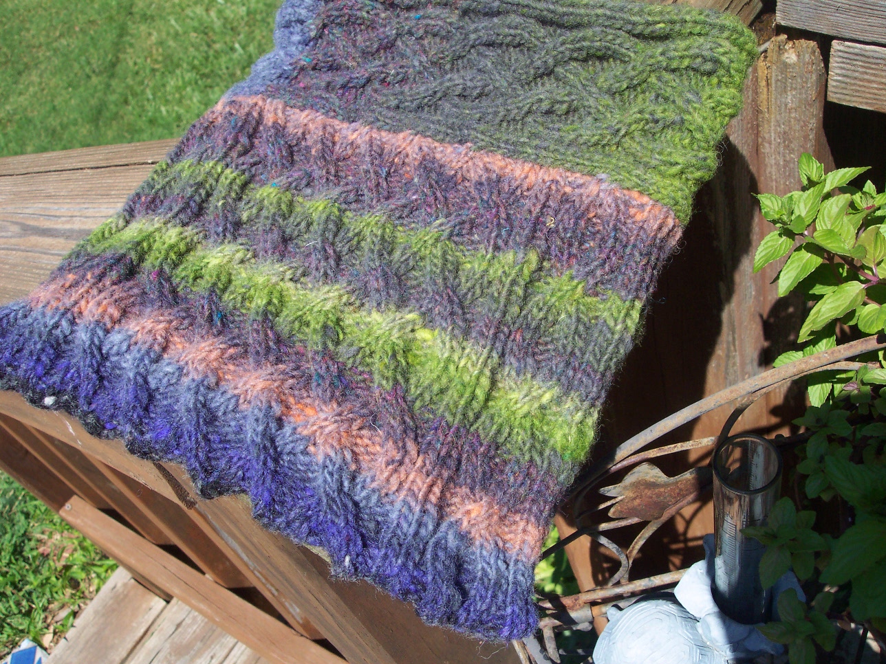 As for the cables, I guess they have their place. I think I'll always be a lace knitter, but I've done enough cabled projects lately that I think I can call myself competent. Frankly, I'm amazed I was able to complete the body of this purse in about two weeks. I have to grudgingly admit that it was the rough stickiness of the Noro that made that possible. I've never had such an easy time cabling without a needle, and that was thanks to the Noro's tendency to stick to itself. And the cables do look impressive, don't they?
