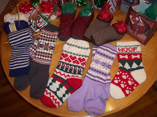 I did it. I knit seven Christmas presents and one birthday present in six and a half weeks, and I did not go crazy. (Or crazier, if you prefer.) Five of the eight came in pairs, and any sock or mitten knitter will tell you that one half of a pair counts as a finished item, so I could claim thirteen finished items. But I won't because a little bit of glory is enough, and I got all the glory I needed last night when my stepmom looked at my sister's Snuggle-Licious Snow Day Socks and said, "You