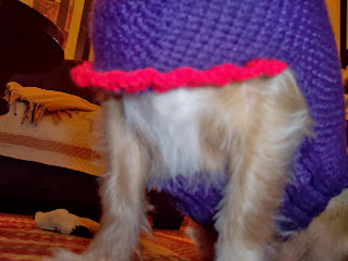 I learned one important lesson while constructing that sweater: You should put the leg holes in where the legs end under the chest, not where they start up at the shoulder. This is an important feature for dog sweaters because doing it wrong adds a lot of unnecessary fabric across the chest and probably makes walking feel kind of funny. Miss Bert would consent to wear the sweater for trips in the car or to go outside for a quick potty, but she refused to go on walks while wearing the sweater. It may be that she is fashion conscious and the grab-bag quality didn't fit her personal style, but I think it's more likely that it felt strange to walk in.